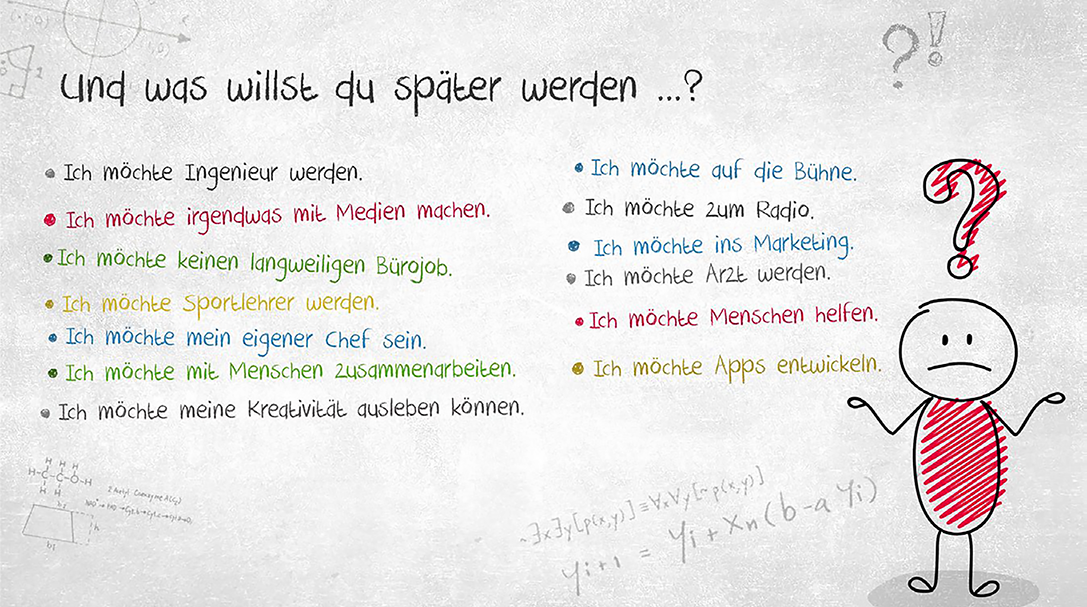 „Und was willst du später werden?“ Diese Frage begleitet Dich bereits seit dem Kindergarten. Inzwischen erwartet Deine Familie eine Antwort von Dir. Vielleicht fühlst du Dich manchmal gedrängt, aber im Grunde wollen Deine Eltern Dich nur in der Berufsfindungsphase unterstützen.