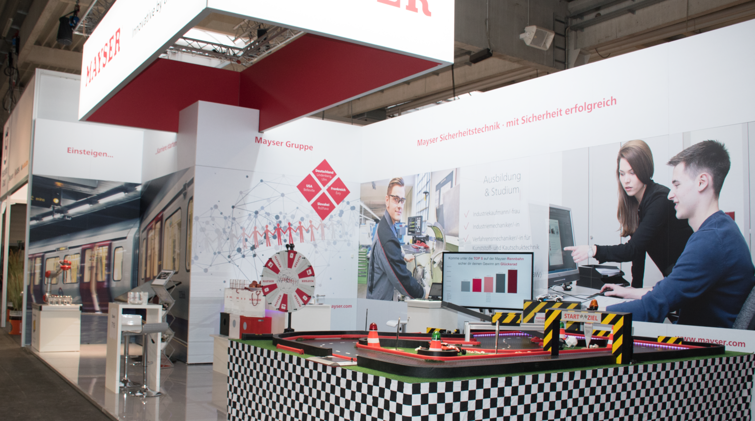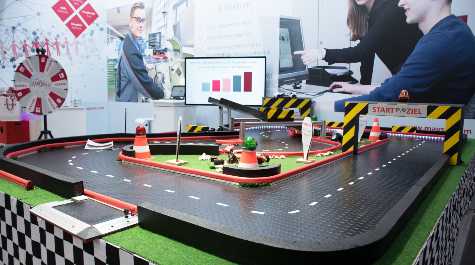 Ein Besuchermagnet auf dem Stand war die Rennbahn, die von den Auszubildenden unter Anleitung der Ausbilder selbst aufgebaut wurde. Sie veranschaulichte den Messebesuchern, wie Mayser-Produkte funktionieren. Die schnellsten Fahrer konnten anschließend an einem Glücksrad drehen und unter anderem Amazon- oder Netflix-Gutscheine gewinnen. Außerdem konnte am Beispiel eines Roboters spielerisch getestet werden, wie Mayser-Sicherheitstechnik die Zusammenarbeit von Mensch und Maschine möglich macht. Das Roboterwerkzeug wurde von den Auszubildenden selbst hergestellt. „Wir freuen uns sehr, dass das Interesse an technischen Berufen gestiegen ist“, so Ralf Michael. „So konnten wir unseren Zukunftsberuf Verfahrensmechaniker gut ins Gespräch bringen“. Auch Stefan Groer, Personalleiter am Standort Ulm, war begeistert. „Wir konnten einige Schüler, die noch keine klare Vorstellung von einer zukünftigen Ausbildung hatten, für die Startmöglichkeiten bei Mayser begeistern. Zudem war das Feedback zu unserem Stand sehr positiv.“