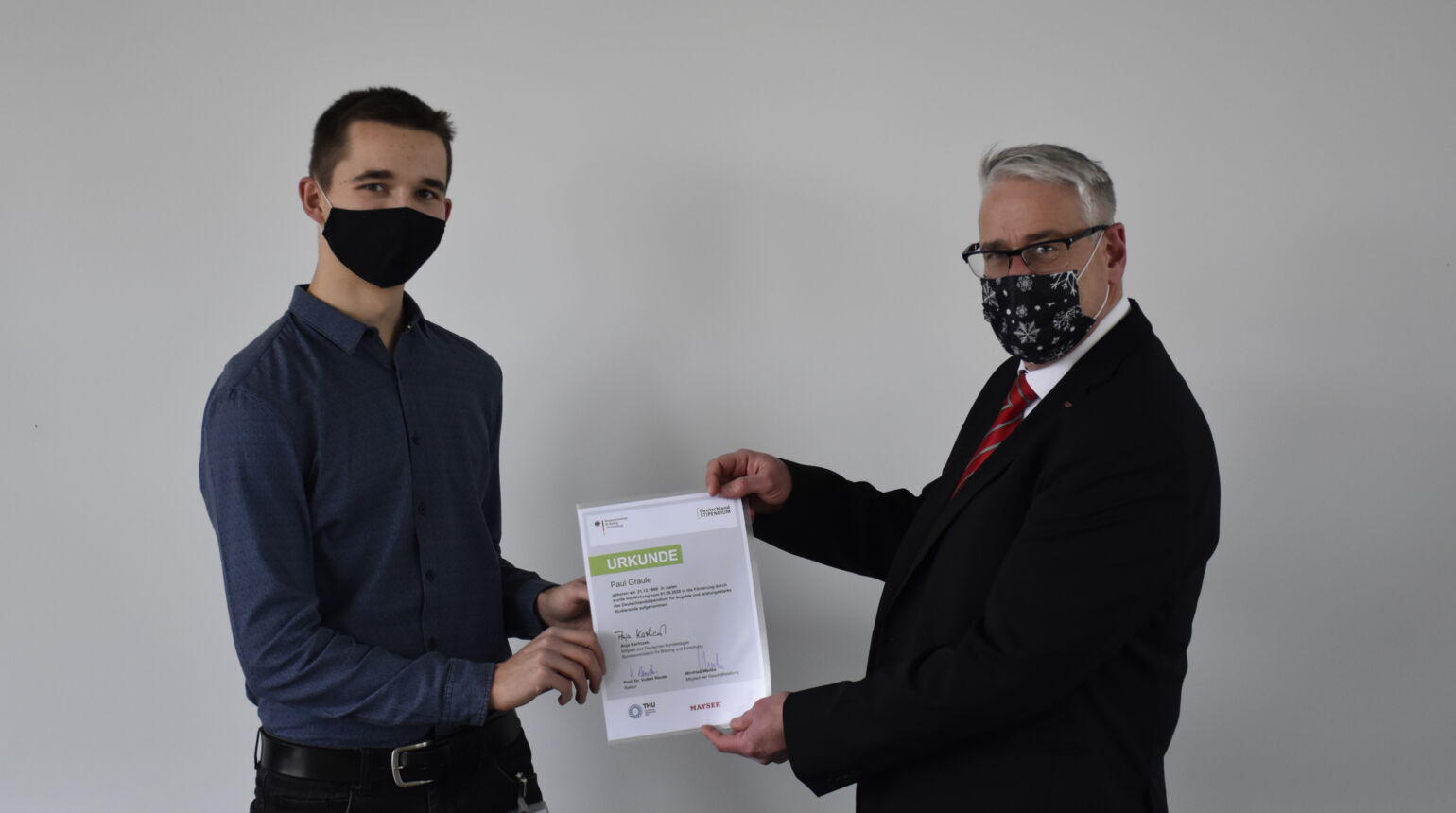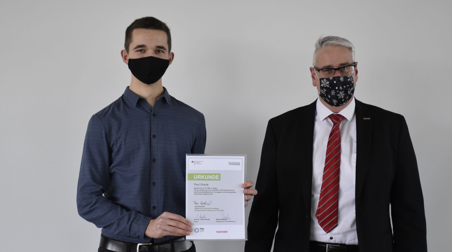 Seit Beginn des Wintersemesters 2019 unterstützt Mayser mit Paul Graule den bereits sechsten Deutschlandstipendiaten. Der Student des Fachbereichs Mechatronik der THU wurde bereits das zweite Jahr in Folge in das Programm für leistungsstarke Studenten aufgenommen. Die Übergabe der Stipendienurkunde fand in diesem Jahr auf Grund der Kontakteinschränkungen im kleinen Kreis direkt im Unternehmen statt. Stefan Groer, Leitung Personal am Standort Ulm, gratulierte dem Stipendiaten und freut sich über die weitere Kooperation.