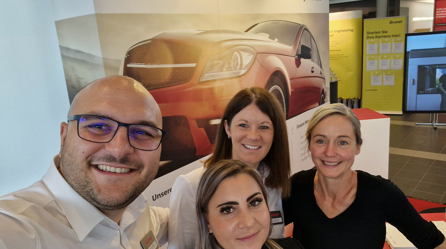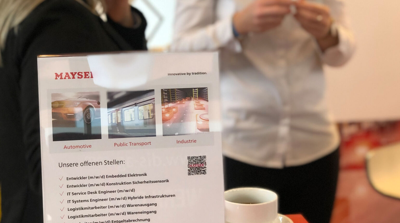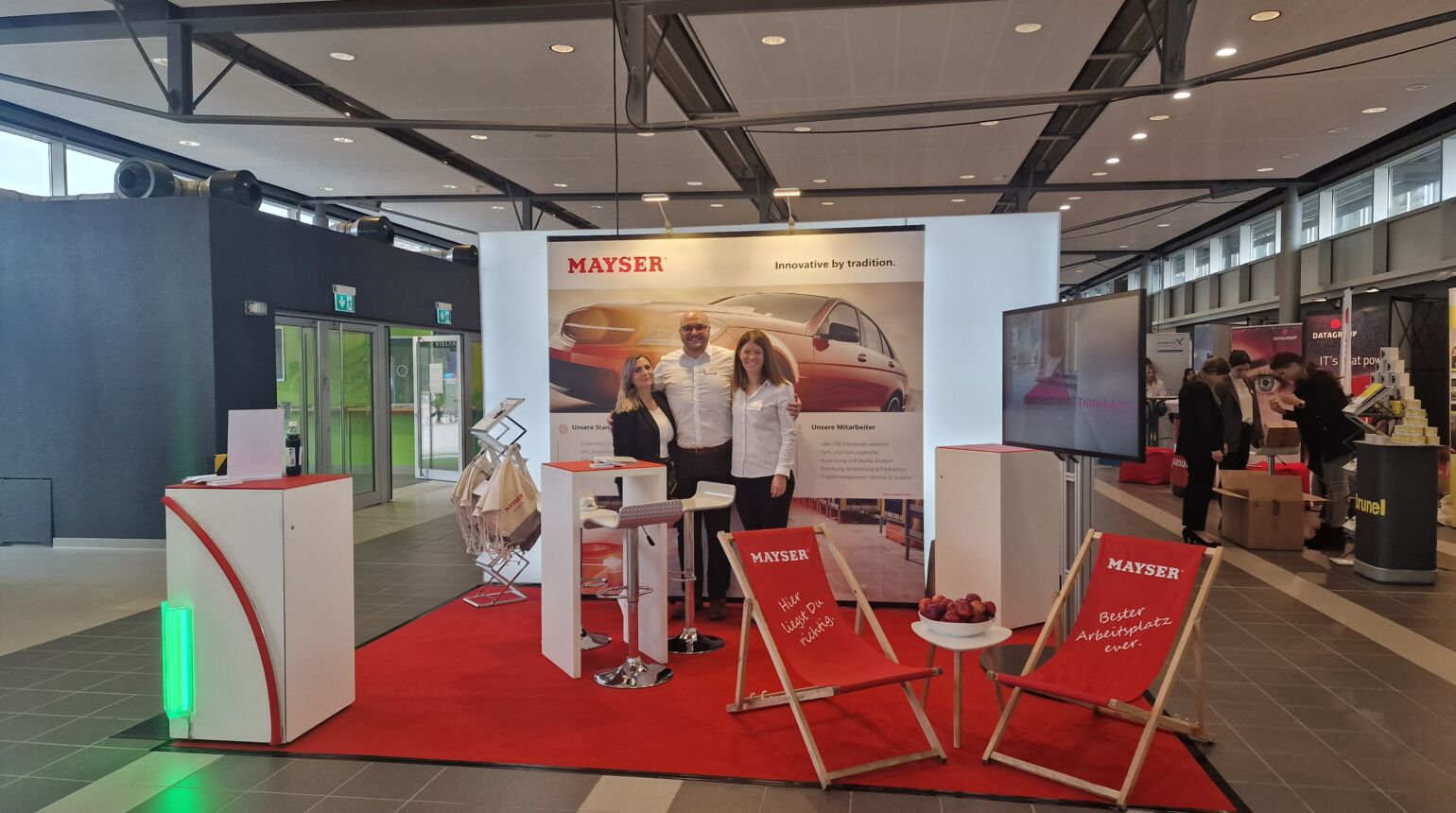 Schon vom Eingang aus leuchtete Besuchern buchstäblich ein roter Teppich entgegen: Auch in diesem Jahr hob sich der Mayser-Stand klar hervor. Ein gemischtes Team aus Projektleitung, Vertrieb und HR informierte über offene Stellen, gesuchte Fähigkeiten und Mayser als Arbeitgeber in der Region.