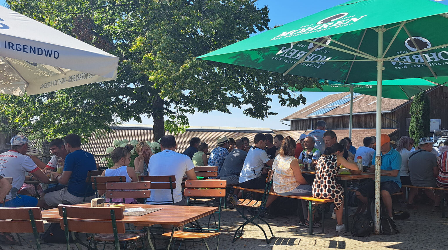 Am Ziel und auf dem Gipfel angekommen warteten kühle Getränke und Kuchen, ganz in Allgäuer Manier übergangslos gefolgt von Brotzeit, Wurstsalat oder anderen deftigen Speisen. Bei Diskussionen, Gelächter und schöner Aussicht auf die Heimat fiel es den Ausflüglern leicht, nach der sportlichen Herausforderung auch etwas länger sitzen zu bleiben.