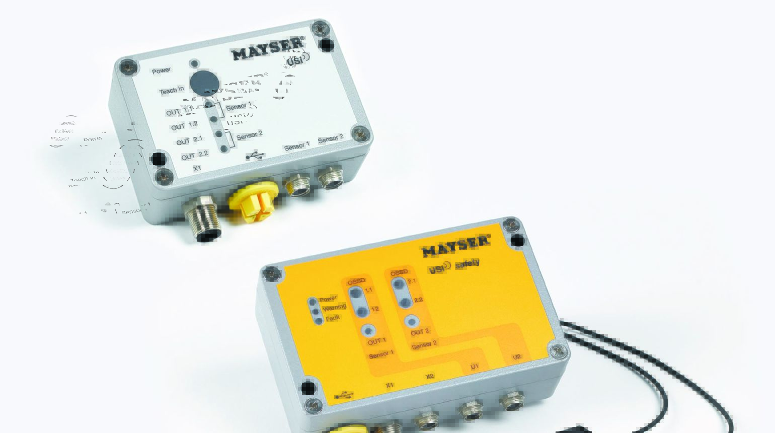 Seine USi® Ultraschallsensoren hat Mayser speziell für die berührungslose Überwachung von dreidimensionalen Räumen entwickelt. Mit einem komplexen Verfahren, bestehend aus Echo-Laufzeitmessung und Echo-Amplitudenmessung kann der moderne Sensor sowohl Distanzen messen als auch Objekte berührungslos erkennen. Der USi® detektiert Objekte aus den verschiedensten Materialien und ist unempfindlich gegen Schmutz, Fremdschall, Luftströmungen und Feuchtigkeit. Zudem verfügt er über sehr kleine, frei positionierbare Wandler, die losgelöst von der Elektronik positioniert und damit sehr flexibel verbaut werden können – auch auf kleinstem Raum. Eine neue spezielle Softwareroutine gibt zusätzliche Sicherheit: Sie unterdrückt gegenseitige Störbeeinflussungen bei der Begegnung zweier unabhängiger Transportsysteme.