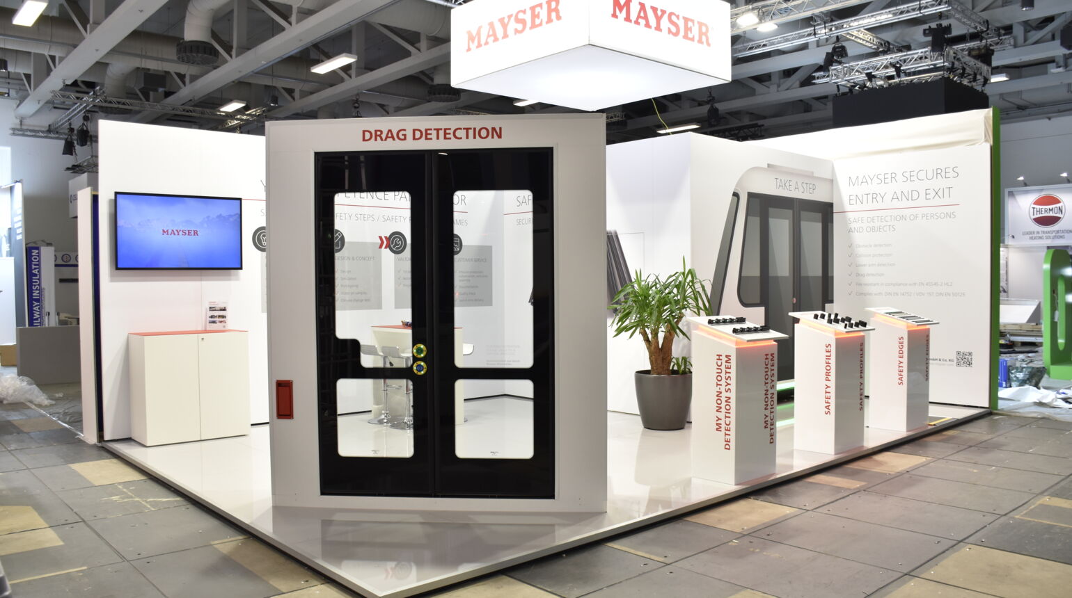 Mayser präsentiert auf der InnoTrans Sicherheitssysteme für den Ein- und Ausstiegsbereich von öffentlichen Verkehrsmitteln mit Fokus auf kapazitiver Technologie und taktilen Sensoren für zuverlässigen Einklemmschutz und Mitschleiferkennung.