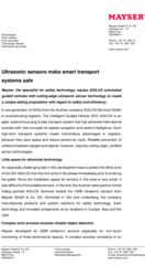 Mayser developed its USi® ultrasonic sensors especially for non-touch monitoring of three-dimensional spaces. A complex process consisting of an echo propagation time measurement and an echo amplitude measurement allows both distance measurements and non-touch object detection by the sensor. The USi® detects objects made of diverse materials and is insensitive to contamination, extraneous sound, air flows and moisture. It also features very compact, freely positionable transducers that can be positioned apart from the electronic system for increased versatility of installation – even in very tight spaces. A special new software routine provides for added safety by suppressing mutual interference if two independent transport systems meet each other.