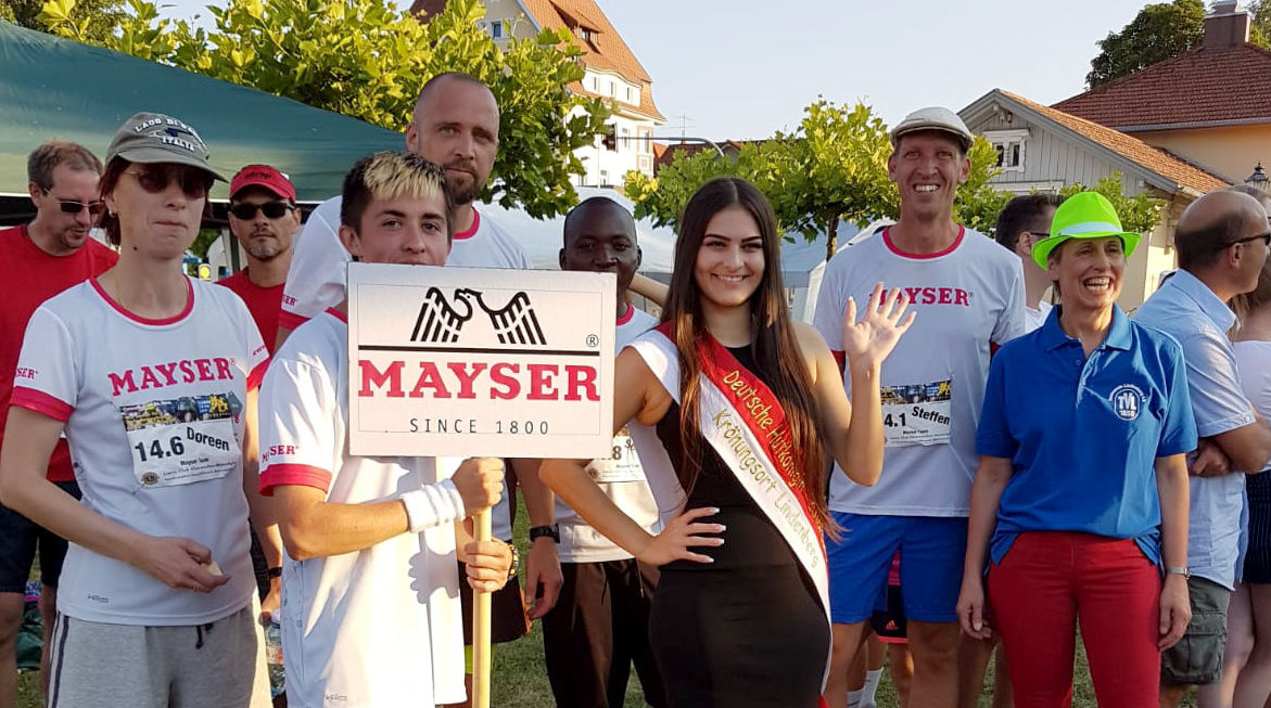 When the starting pistol was fired for the all-day run in the city park at 8:00 am, the temperatures were still pleasant. That would change soon: The thermometer climbed as high as 29 degrees in the midday hours. For the well-trained employees of Mayser, the heat was not a problem. The team of eight runners plus a substitute runner completed 131 laps of 1,050 metres each and was thus able to place well amongst the middle of the pack. The endurance athletes were not about the victory that day; the focus was on the good cause and the fun of running. Two teams were sponsored by Mayser Lindenberg for 500 euros each.